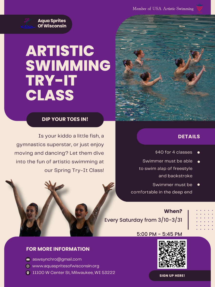 The class is for swimmers who are new to artistic (synchronized) swimming and is approximately an hour per week. Swimmers must be able to independently swim 25 yards, be comfortable underwater, as well as, in deep water and be at least 8 years of age. Participants will learn the basic skills and figures. Those skills and figures will be put to counts to form a small routine set to music. Class participants are non competitive, and therefore do not participate in the swim meets.